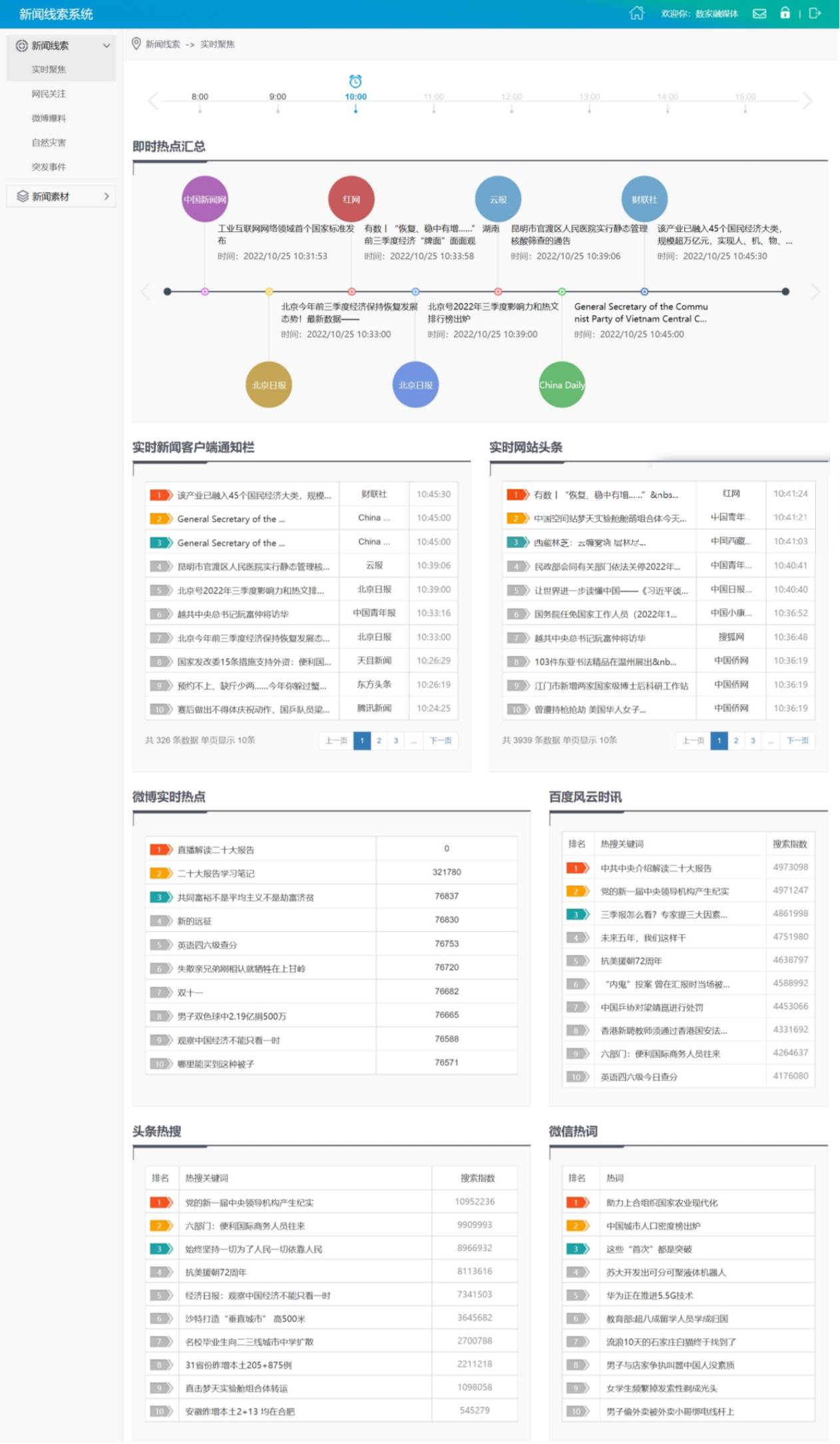 面向全网数据,通过线索发现技术实时发现互联网高价值内容,并通过多维知识库及智能语义技术进行线索聚合,追踪分析,发展趋势预测,包含实时聚焦 沙巴体育app下载,网民关注,微博爆料,突发事件,自然灾害,近期政策,近期会议,历史今天等功能模块。