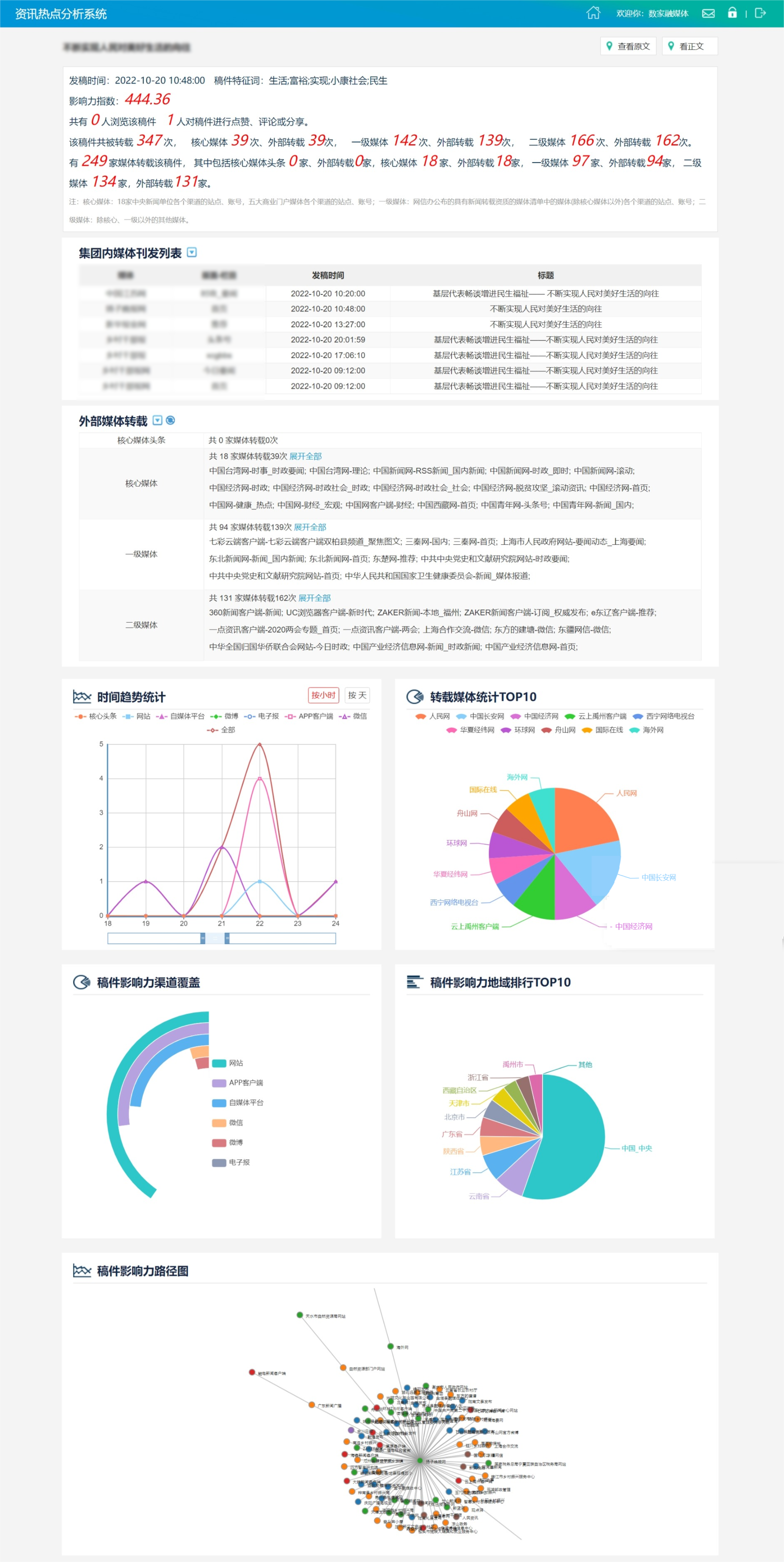 基于报纸,网站,微博,微信,客户端,第三方公众平台抓取到的数据,运用原创内容识别,文本相似度分析等大沙巴体育安卓版技术,结合稿件传播影响力数据模型和指标体系,对原创稿件的全网传播效果进行持续性的实时分析 沙巴体育手机版,包括传播转载分析,阅读互动分析,传播轨迹可视化分析和多维报表自动生成等。