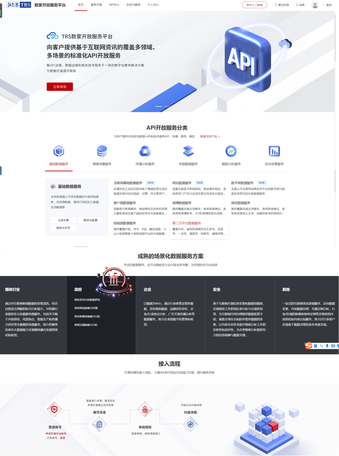 提供基于互联网资讯的覆盖多领域、多场景的标准化API开放服务。数家将多年积累的业务经验和技术优势以API的方式对外开放,采用一站式接入服务,提供专业的技术支持与API文档、调试工具及示例,全程为开发加速。目前平台提供200余种API接口,涵盖基础数据服务、增值场景服务、智能分析服务、传播分析服务、专题分析服务、定向采集服务,全方位赋能多元内容业务场景,为用户提供丰富的选择。