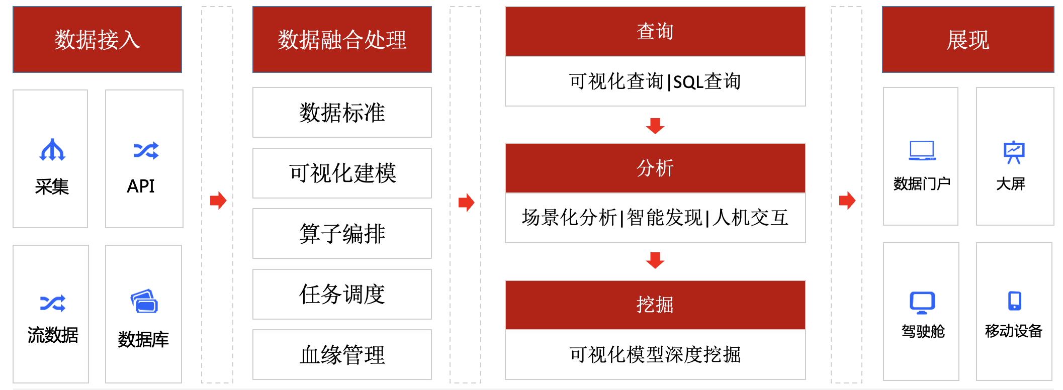 “天骄”数据中台支持多种来源的异构数据接入到数据中台,包括通过 HTTP/HTTPS 接口推送,各种消息中间件,关系型和非关系型数据库接入,完成数据质量检查和标准数据转换等工作 沙巴体育app下载。