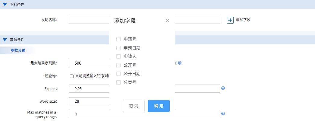 在基因专利序列检索时通过专利条件中的发明名称、申请号、申请人等限定基因专利检索范围,