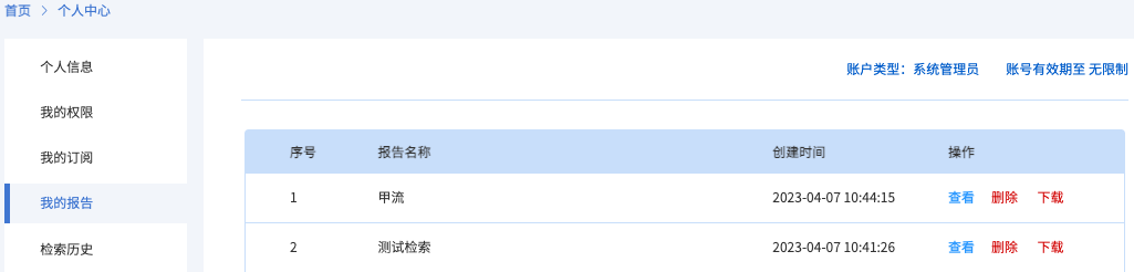个人中心-我的报告中,可以查看所有检索报告,可对检索报告进行查看/删除/下载,等操作